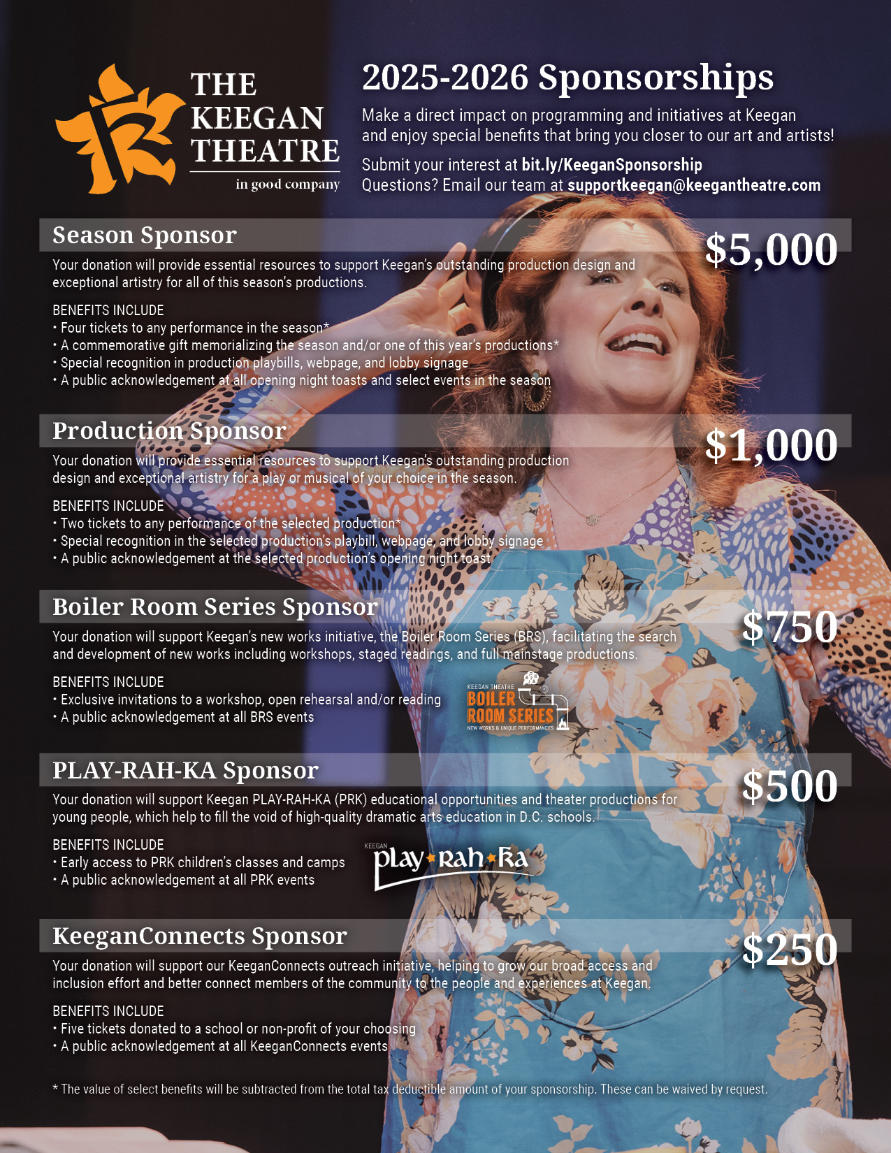 The Keegan Theatre is a 501(c)(3) nonprofit organization, so your gift is fully tax-deductible. If you have any questions about giving to Keegan, please email supportkeegan@keegantheatre.com.